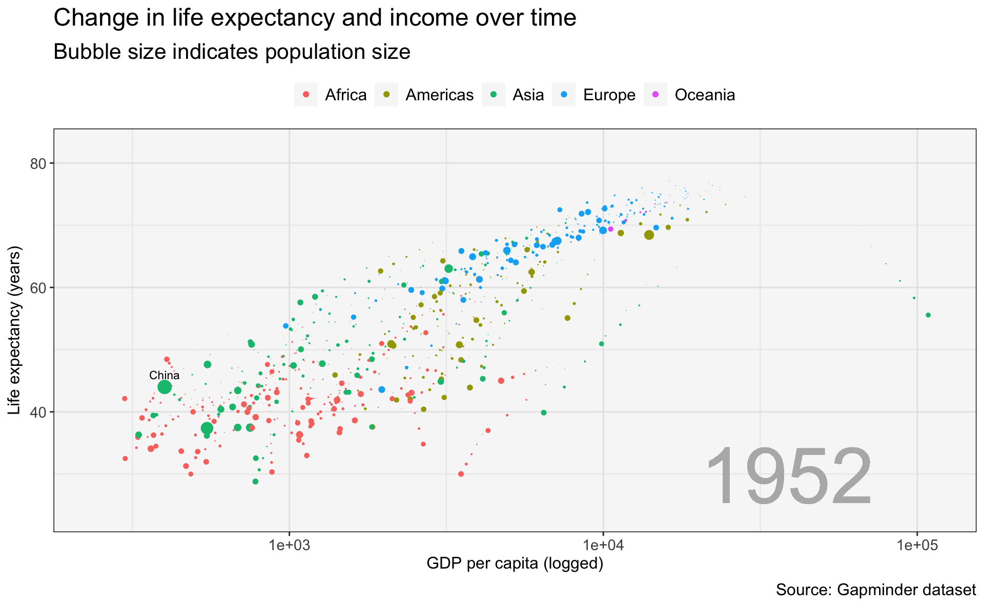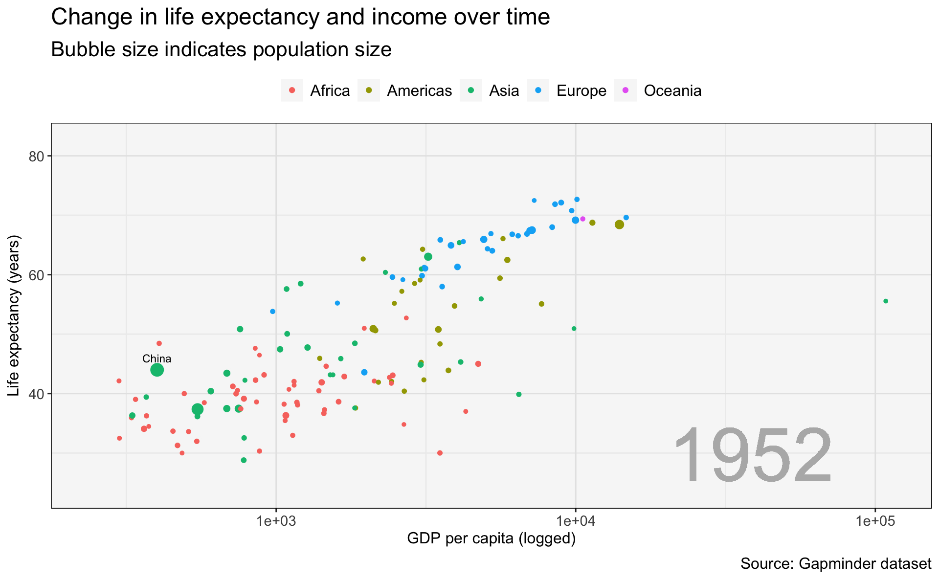 to reproduce the classic animated visualization by Hans Rosling of Gapminder data.
