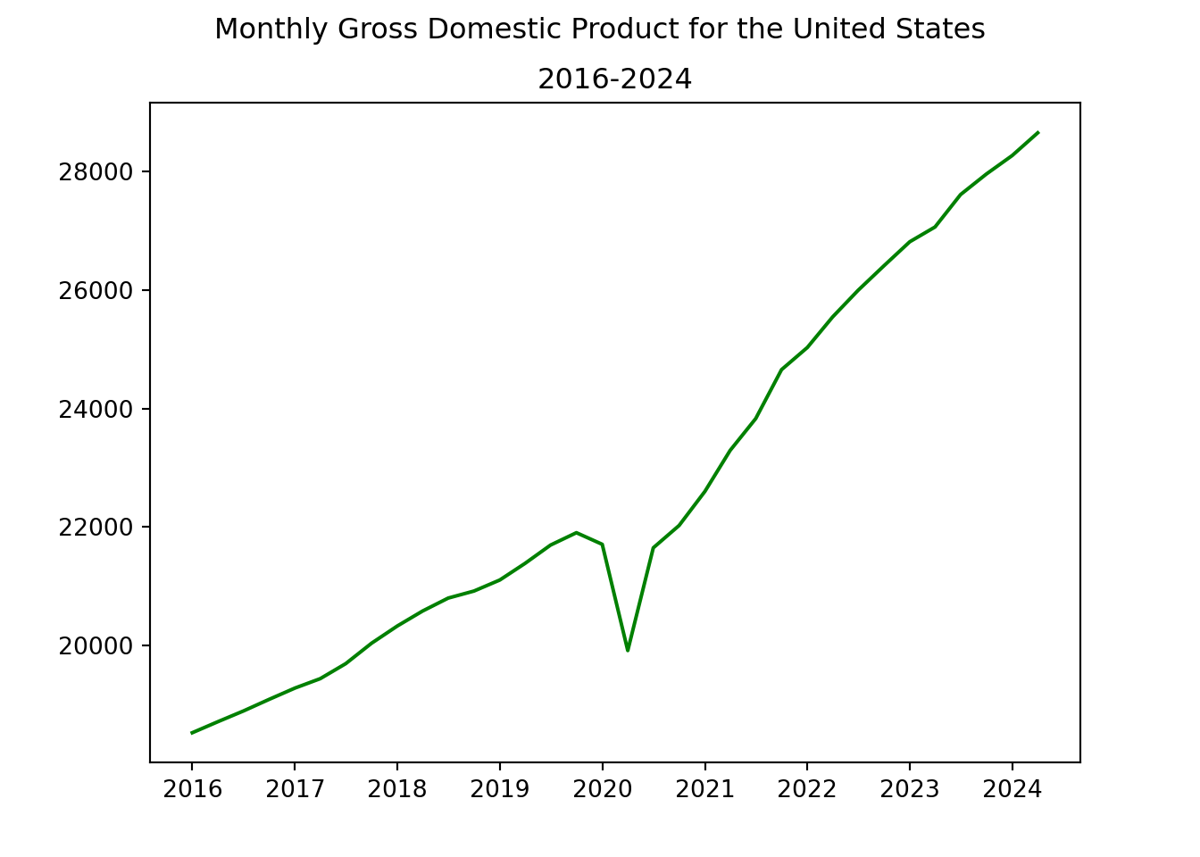 plt.plot(gdp_data['DATE'], gdp_data['GDP'], color='green')plt.suptitle('Monthly Gross Domestic Product for the United States')plt.title('2016-2024')plt.show()