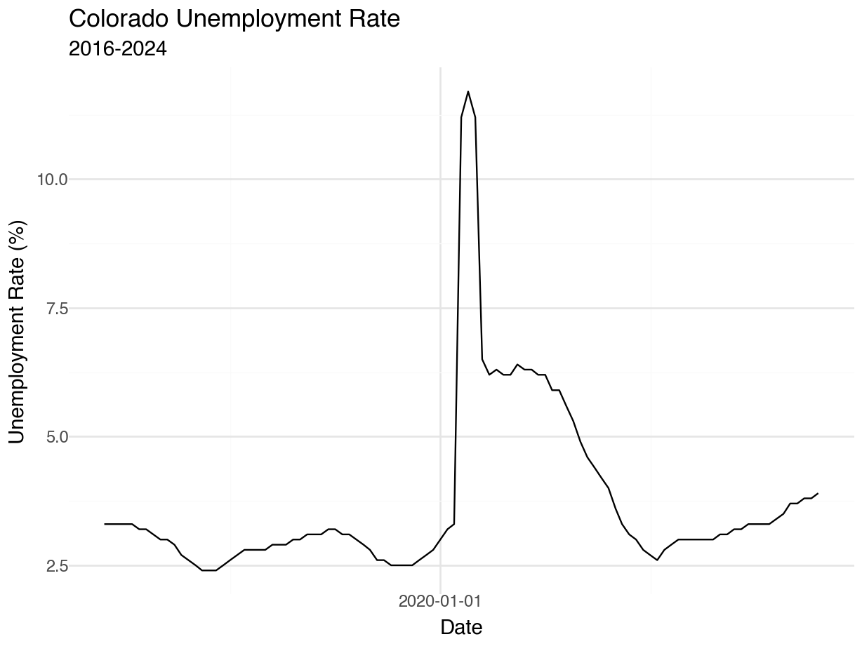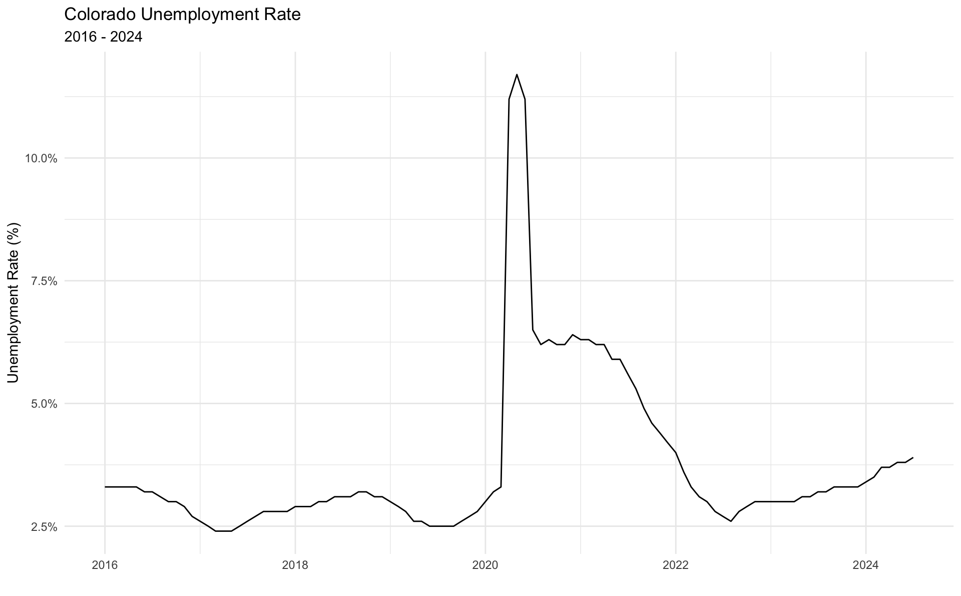 I’ll fetch Colorado’s unemployment rate during this time period (January 2016 to August 2024).