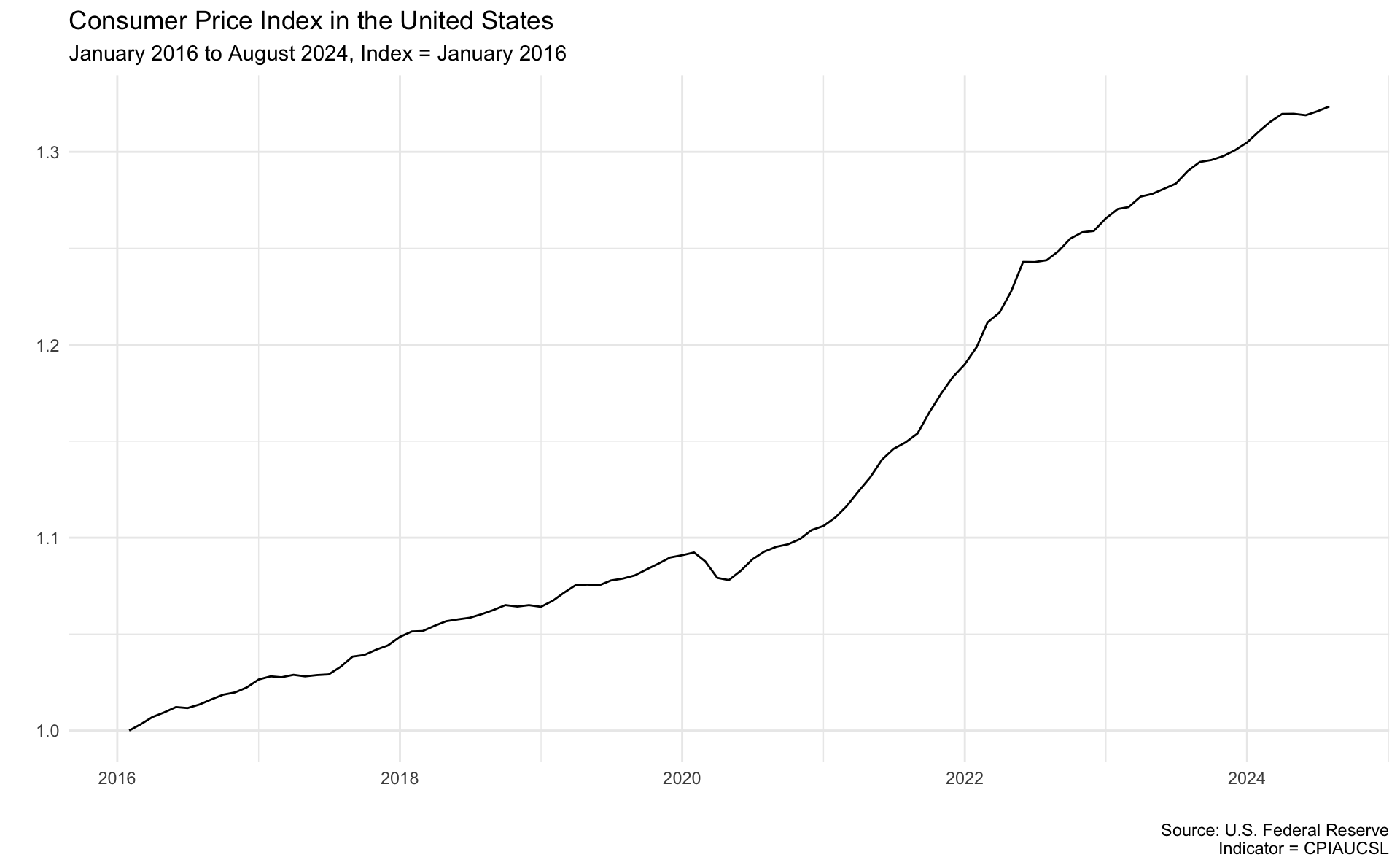cpi %>%ggplot(aes(x=DATE,y=indexed_cpi_2016)) +geom_line() +labs(title='Consumer Price Index in the United States',subtitle='January 2016 to August 2024, Index = January 2016',caption='Source: U.S. Federal Reserve\nIndicator = CPIAUCSL',x='',y='') +theme_minimal()