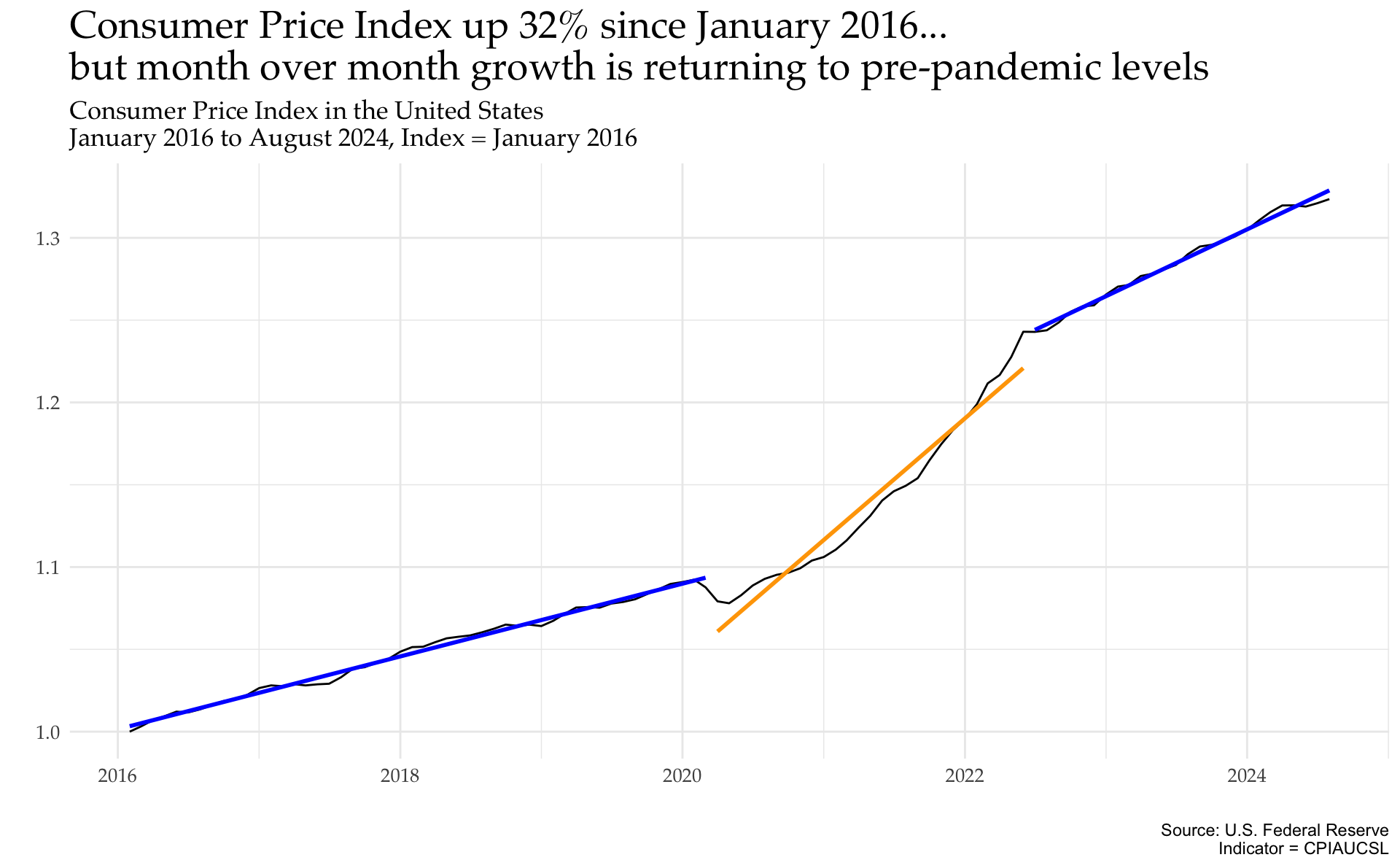 cpi %>%ggplot(aes(x=DATE,y=indexed_cpi_2016)) +geom_line() +geom_smooth(data=. %>%filter(DATE <='2020-03-01'),formula=y~ x,se=FALSE,color='blue',method='lm') +geom_smooth(data=. %>%filter(DATE >'2020-03-01'& DATE <='2022-06-01'),formula=y~ x,se=FALSE,color='orange',method='lm') +geom_smooth(data=. %>%filter(DATE >'2022-06-01'),formula=y~ x,se=FALSE,color='blue',method='lm') +labs(title='Consumer Price Index up 32% since January 2016...\nbut month over month growth is returning to pre-pandemic levels',subtitle='Consumer Price Index in the United States\nJanuary 2016 to August 2024, Index = January 2016',caption='Source: U.S. Federal Reserve\nIndicator = CPIAUCSL',x='',y='') +theme_minimal() +theme(plot.title =element_text(family ='Palatino', size=20),plot.subtitle =element_text(family ='Palatino', size=13),axis.text =element_text(family ='Palatino', size=10))