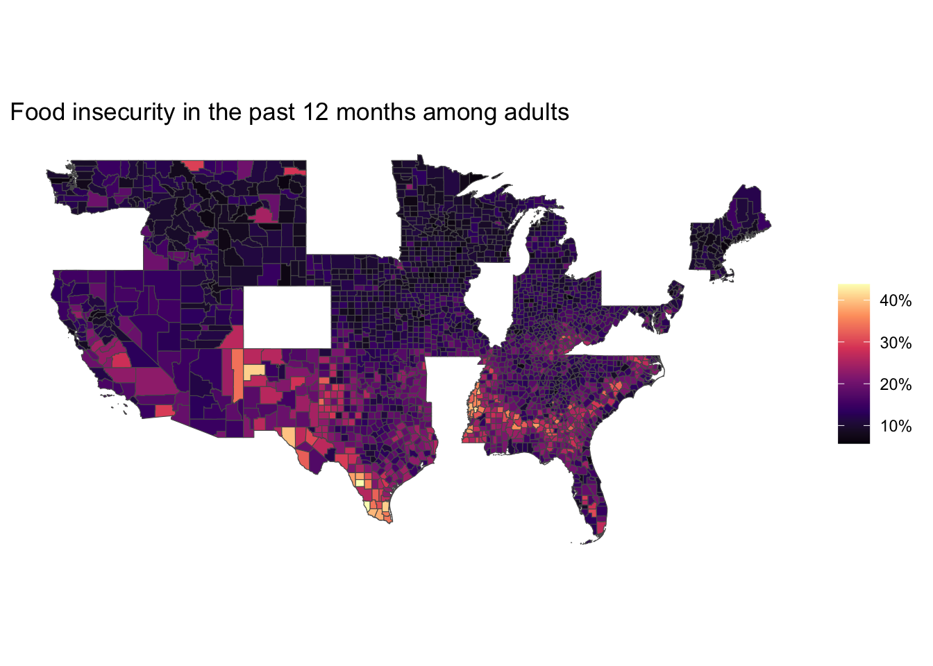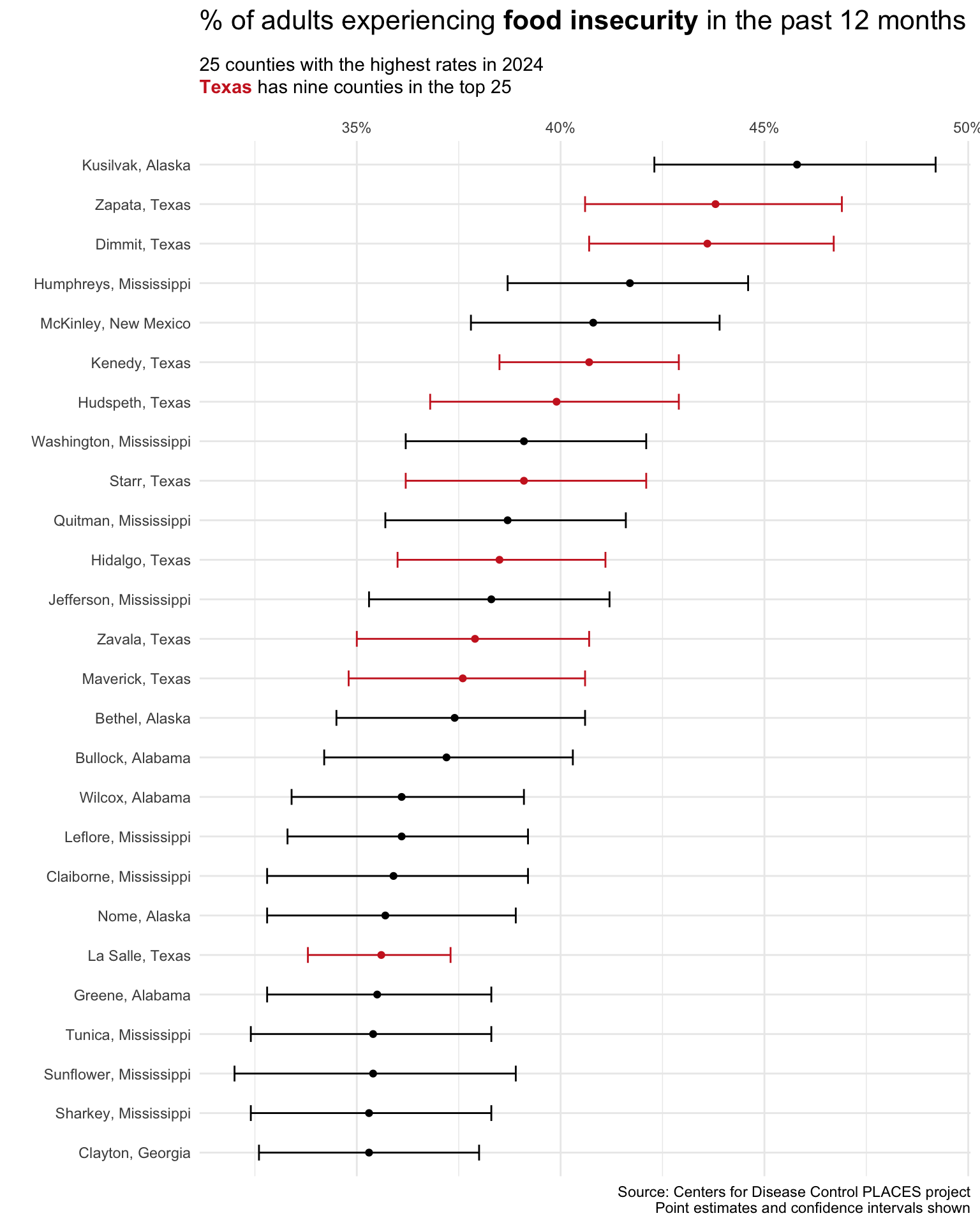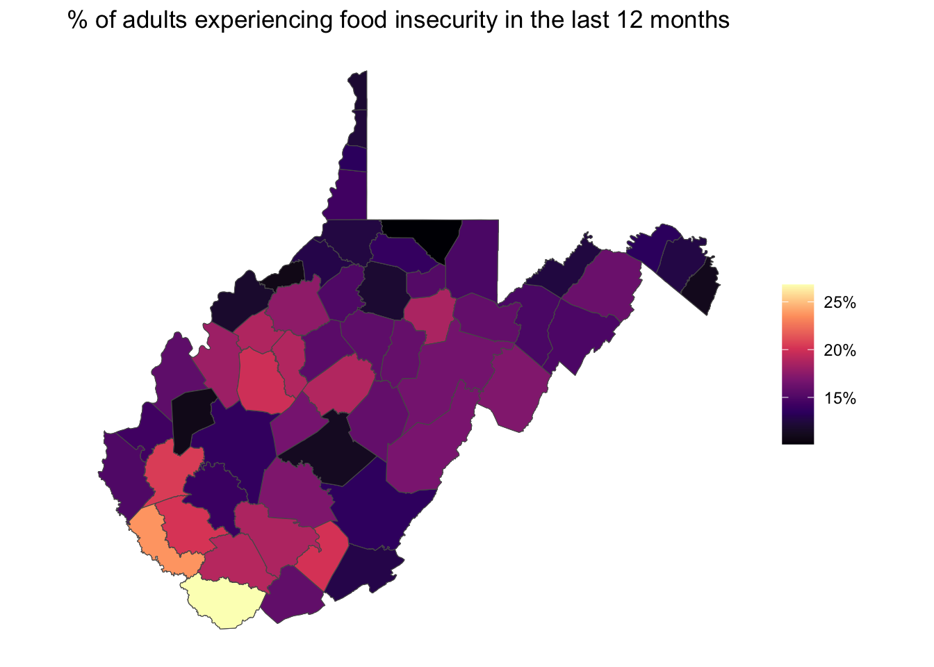 function comes in handy for that. I’ll visualize the top 25 food insecure counties, along with their confidence intervals.And I’ll visualize the food insecurity data from my home state, West Viriginia, where parts of central and southern West Virginia experience the highest rates of food insecurity in the state.