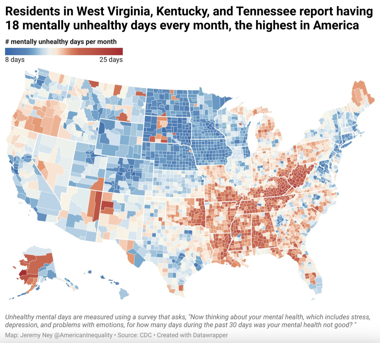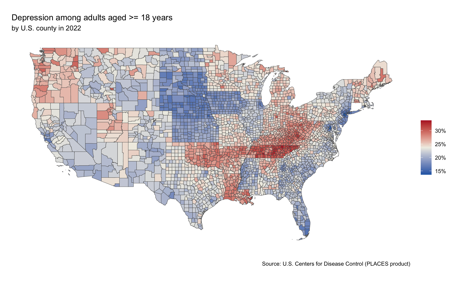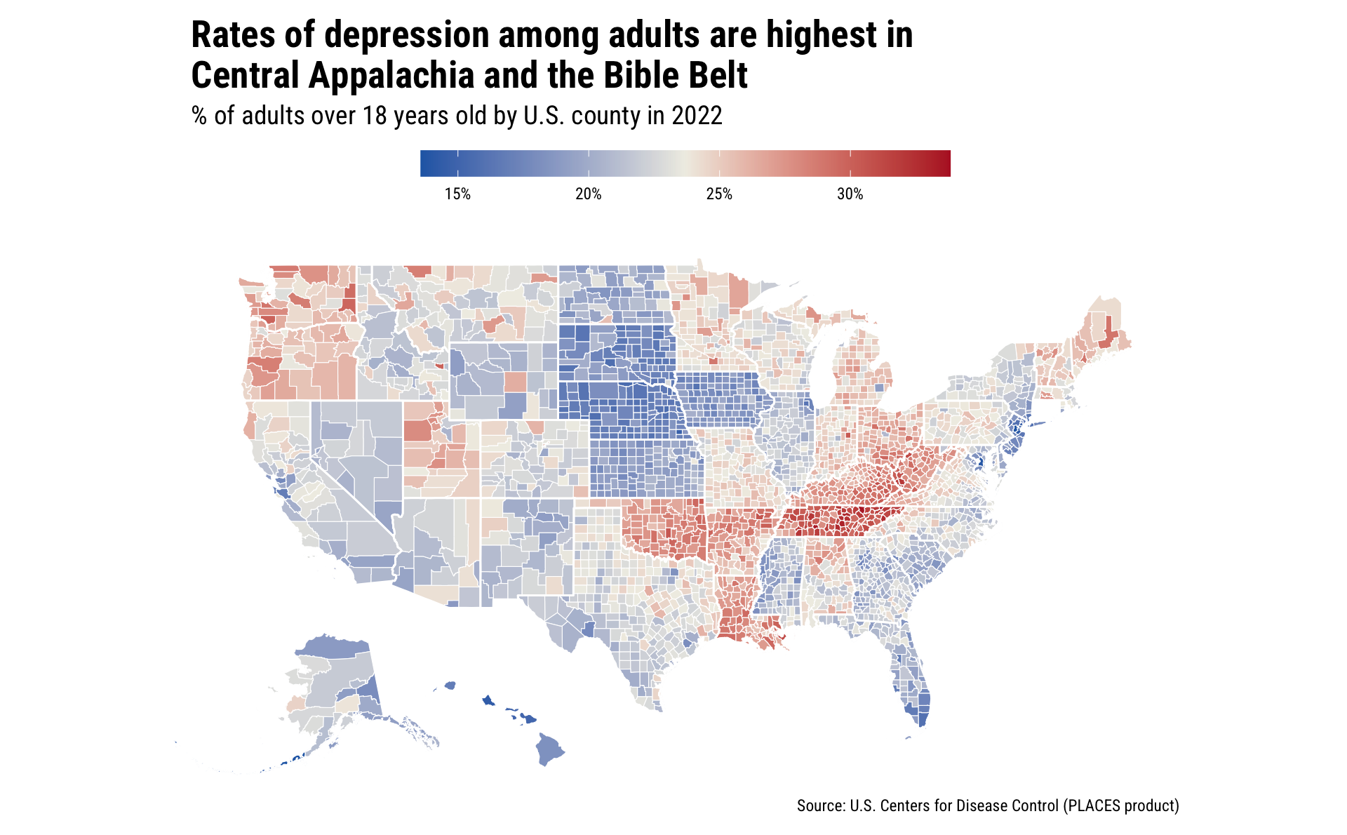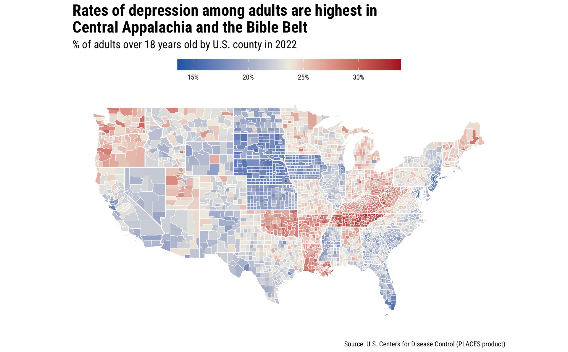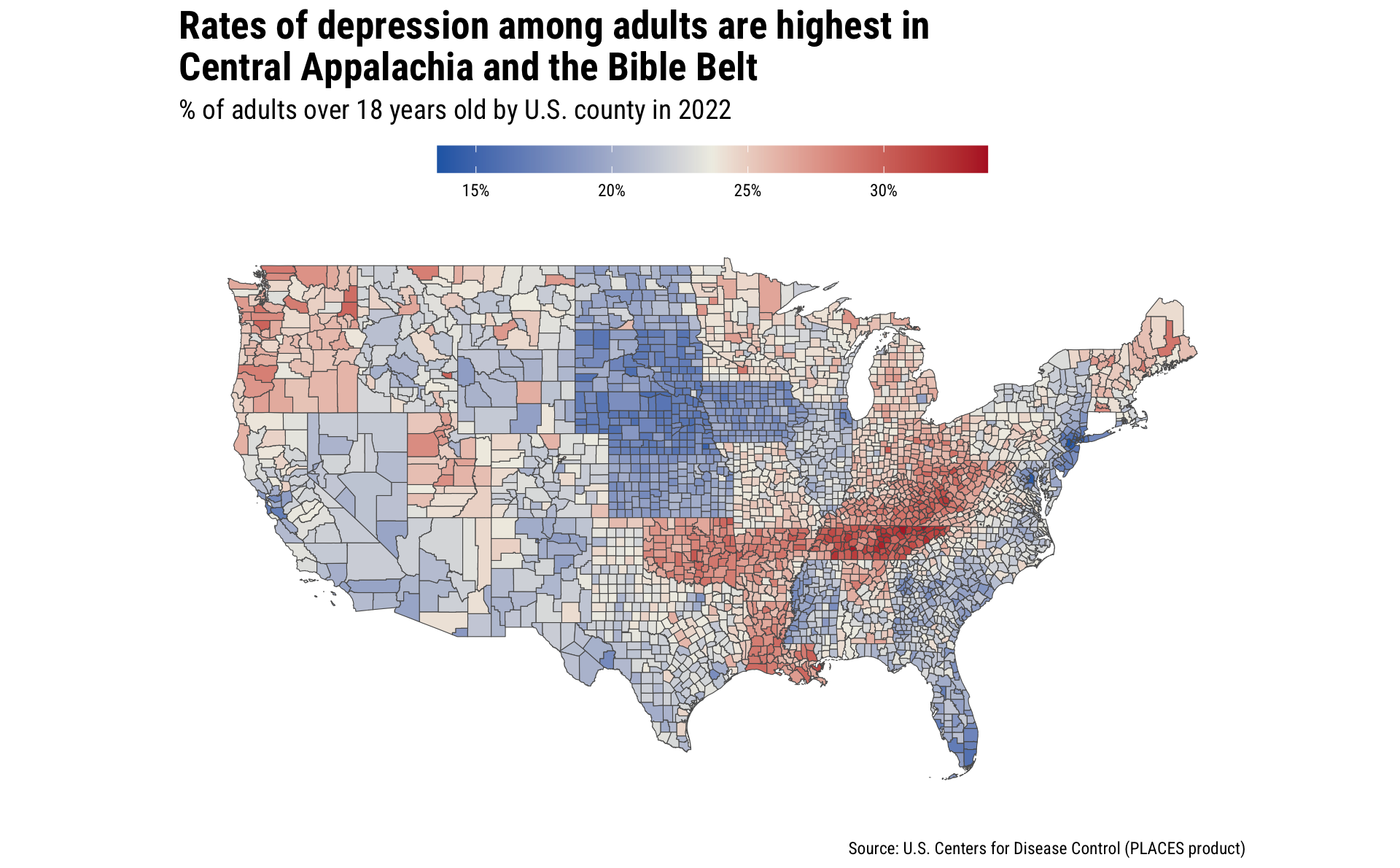 ggtitle('Rates of depression among adults are highest in\nCentral Appalachia and the Bible Belt',