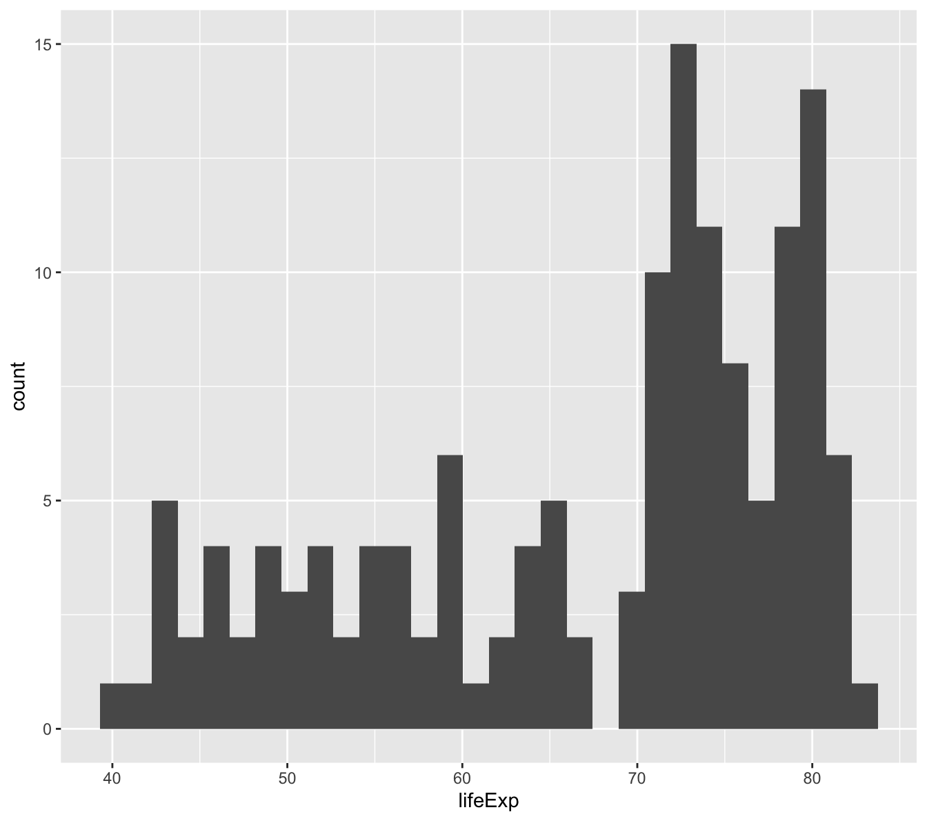 Finally, we added the geom to the aesthetic, which tells ggplot the type of graphic that we wanted to create (geom_histogram()).