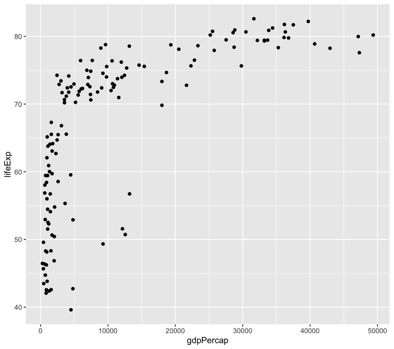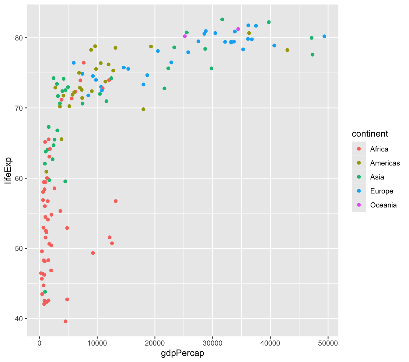 You’ll recall from the dplyr functions that we’ve learned so far that piping is an effective way to write code that flows between functions. First, we piped the gapminder data to filter(), then we piped that filtered dataframe to ggplot().