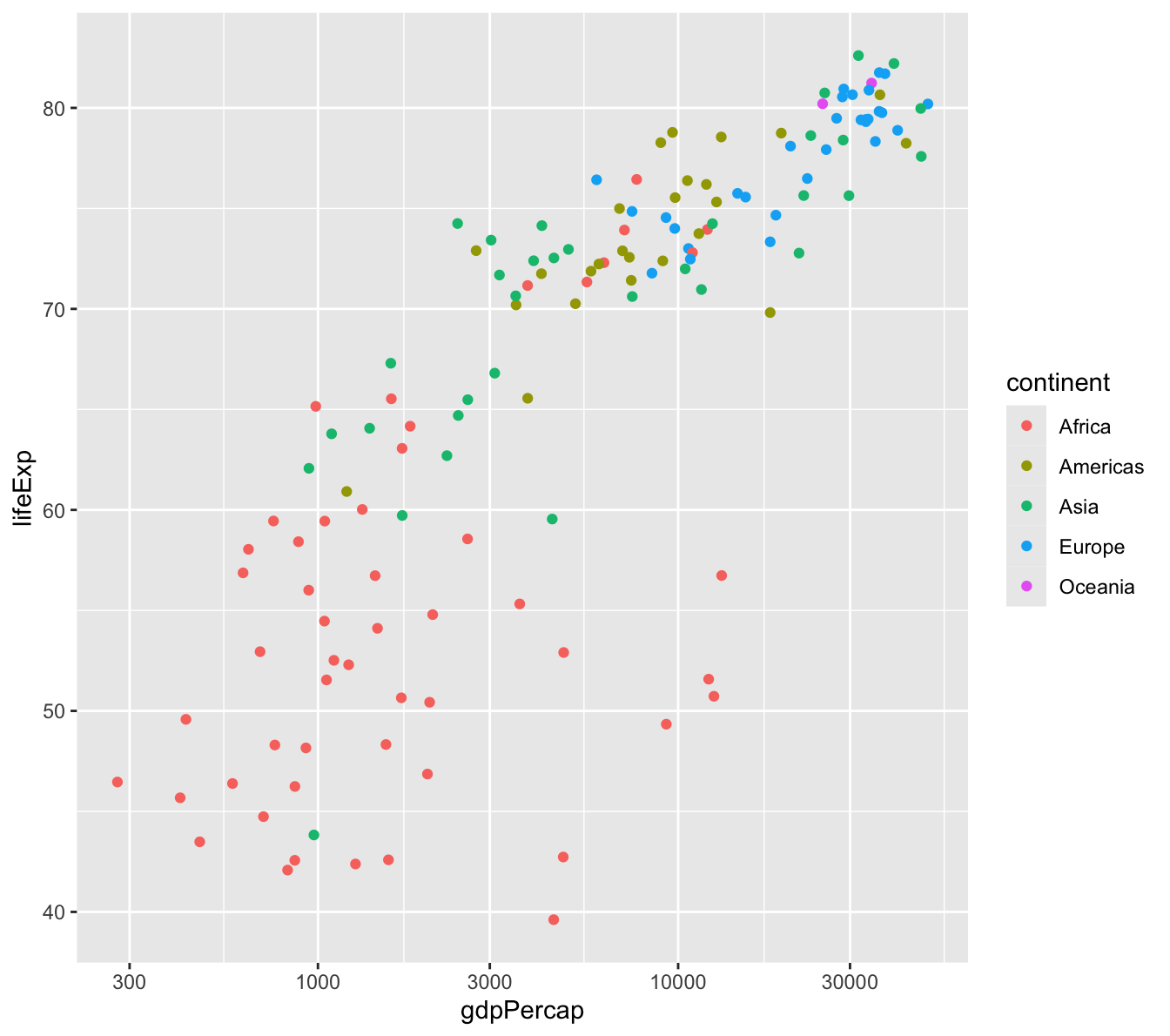 gapminder %>%#DATAfilter(year ==2007) %>%#DATAggplot(aes(x=gdpPercap, #AESTHETICy=lifeExp, #AESTHETICcolor=continent)) +#AESTHETICgeom_point() +#GEOMscale_x_log10() #CUSTOMIZING ELEMENT