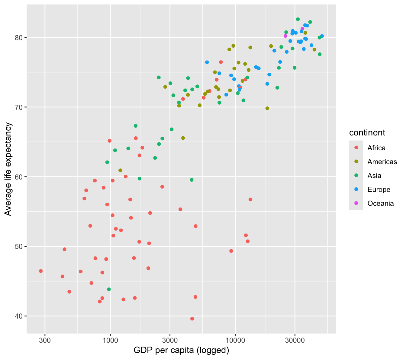 gapminder %>%#DATAfilter(year ==2007) %>%#DATAggplot(aes(x=gdpPercap, #AESTHETICy=lifeExp, #AESTHETICcolor=continent)) +#AESTHETICgeom_point() +#GEOMscale_x_log10() +#CUSTOMIZING ELEMENTlabs(x='GDP per capita (logged)', #CUSTOMIZING ELEMENTy='Average life expectancy') #CUSTOMIZING ELEMENT