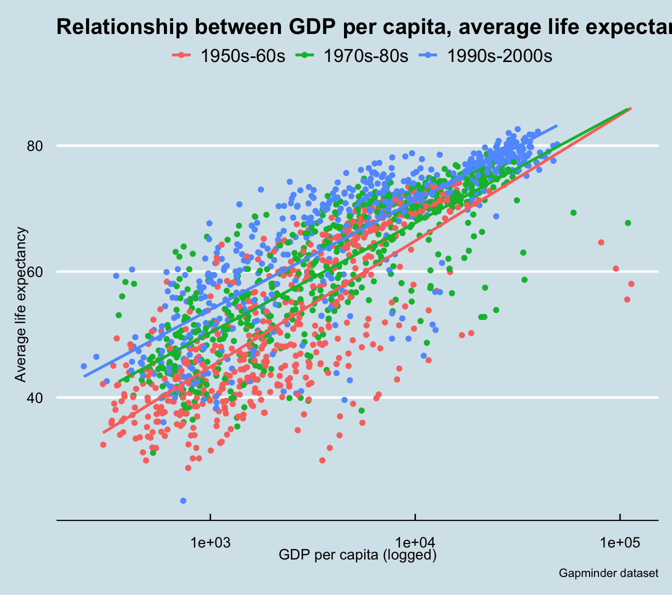 gapminder %>%mutate(generation=ifelse(year <1970, '1950s-60s',ifelse(year >=1970& year <1990, '1970s-80s', '1990s-2000s'))) %>%ggplot(aes(x=gdpPercap,y=lifeExp,color=generation)) +geom_point() +scale_x_log10() +geom_smooth(method ="lm", se=FALSE) +ggtitle('Relationship between GDP per capita, average life expectancy, and time') +labs(x='GDP per capita (logged)',y='Average life expectancy',color='',caption='Gapminder dataset') +theme_economist()