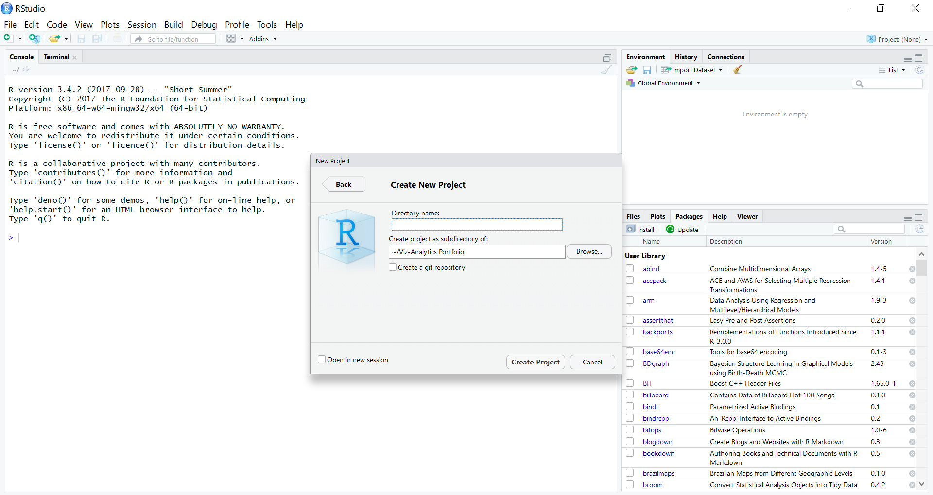 4. Type in a name for your project under “Directory name”. Choose the location where you want this R Project to live on your computer. Select Create Project.