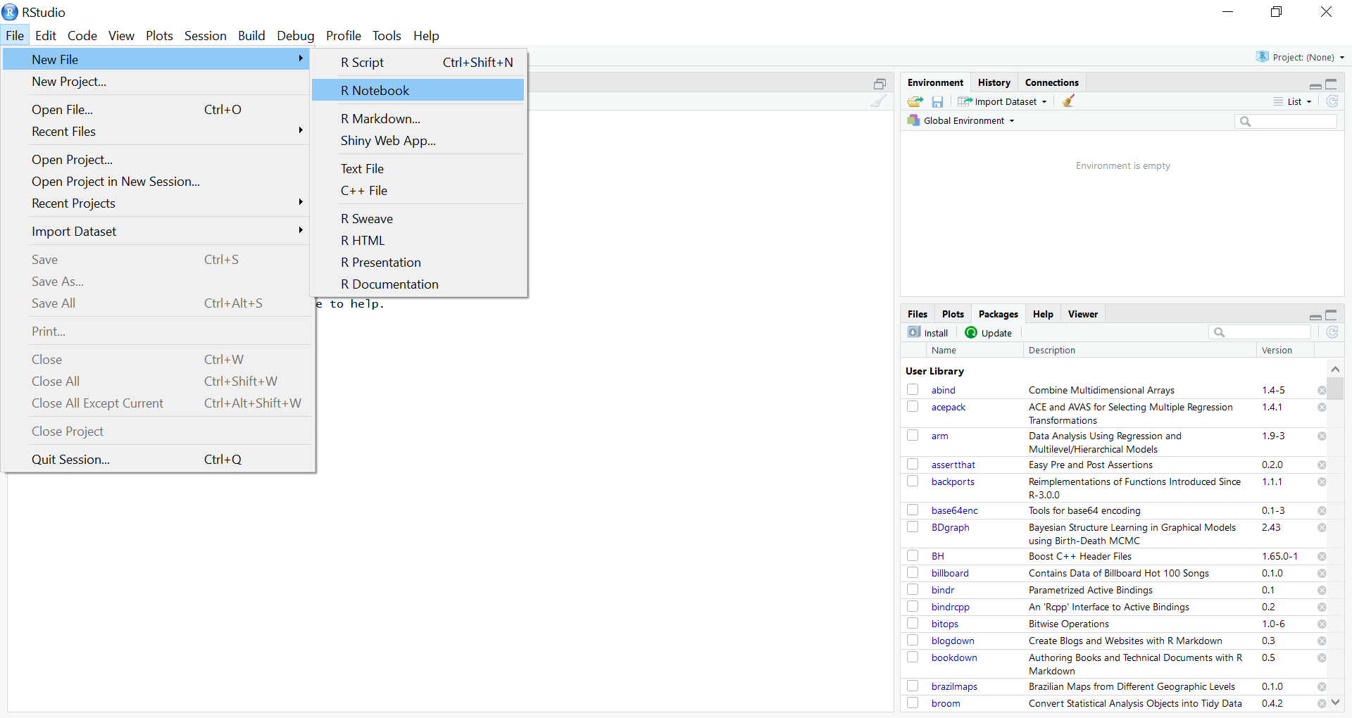 Finally, go to File –> New File –> R Notebook. R notebook files are an excellent way to perform an analysis, because they allow for R code and documentation to work side-by-side. This enables you to tell a story that moves alongside your quantitative analysis, and it can be output in all kinds of formats, including Word documents, .pdfs, and .html files.